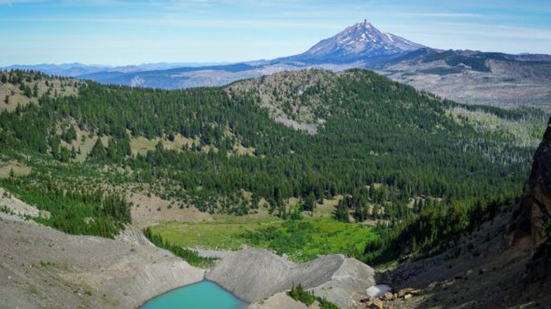 It is harder to scramble up the loose rock of the moraine (going down you have to be careful), but we always do this and reach the saddle between Three Fingered Jack and a nearby peak which we have nicknamed "Dragon Mountain". From there, stunning views of the Three Sisters, Broken Top and Mt Bachelor can be seen. Looking the other way, views of Mt Jefferson can't be missed. During this trip, we also saw a nearby mountain goat; these goats were reintroduced to the Mt. Jefferson Wilderness around Three Fingered Jack in 2010 and have grown in number.