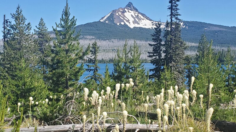 For those who are looking for a Bear grass hike in Central Oregon, Patjens Lakes Loop Trail is hard to beat the end of June 2025. When hikers leave Hwy 20 to drive to the paved trailhead near the end of Big Lake Road, blooming Bear grass can be seen on each side of the road, a great indicator that the hike has a significant amount of it seen during the trek. Patjens Lakes Loop Trail runs adjacent to Big Lake at Santiam Pass before it leaves the lake to run south into the Mt. Washington Wilderness where it skirts the 4 small Patjens Lakes before returning to the starting point next to Big Lake. There are still signs of the B & B complex fire of 2003 which burned over 90,000 acres in the Mt Washington and Mt Jefferson Wildernesses, running along the crest of the Cascades. However devastating the fire was to the area, the burned areas provided more growing areas to sun-loving plants, such as Bear grass.